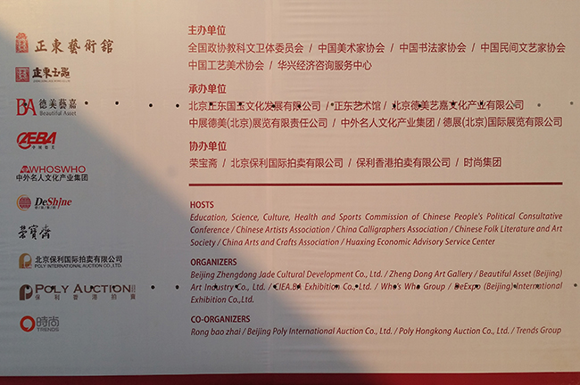 此屆盛會是由全國政協(xié)教科文衛(wèi)體委員會、中國美術家協(xié)會、中國書法家協(xié)會、中國民間藝術家協(xié)會、中國工藝美術協(xié)會、華興經(jīng)濟咨詢服務中心共同主辦,北京正東國玉文化發(fā)展有限公司、正東藝術館、北京德美藝嘉文化產(chǎn)業(yè)有限公司、德展(北京)國際展覽有限公司、中展德美展覽有限責任公司、中外名人文化產(chǎn)業(yè)集團聯(lián)合承辦,榮寶齋、北京保利國際拍賣有限公司、保利香港拍賣有限公司、時尚集團聯(lián)合協(xié)辦。